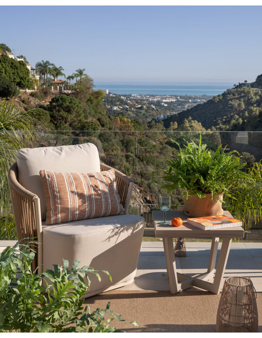 Outdoor armchair with low aluminum and rope backrest